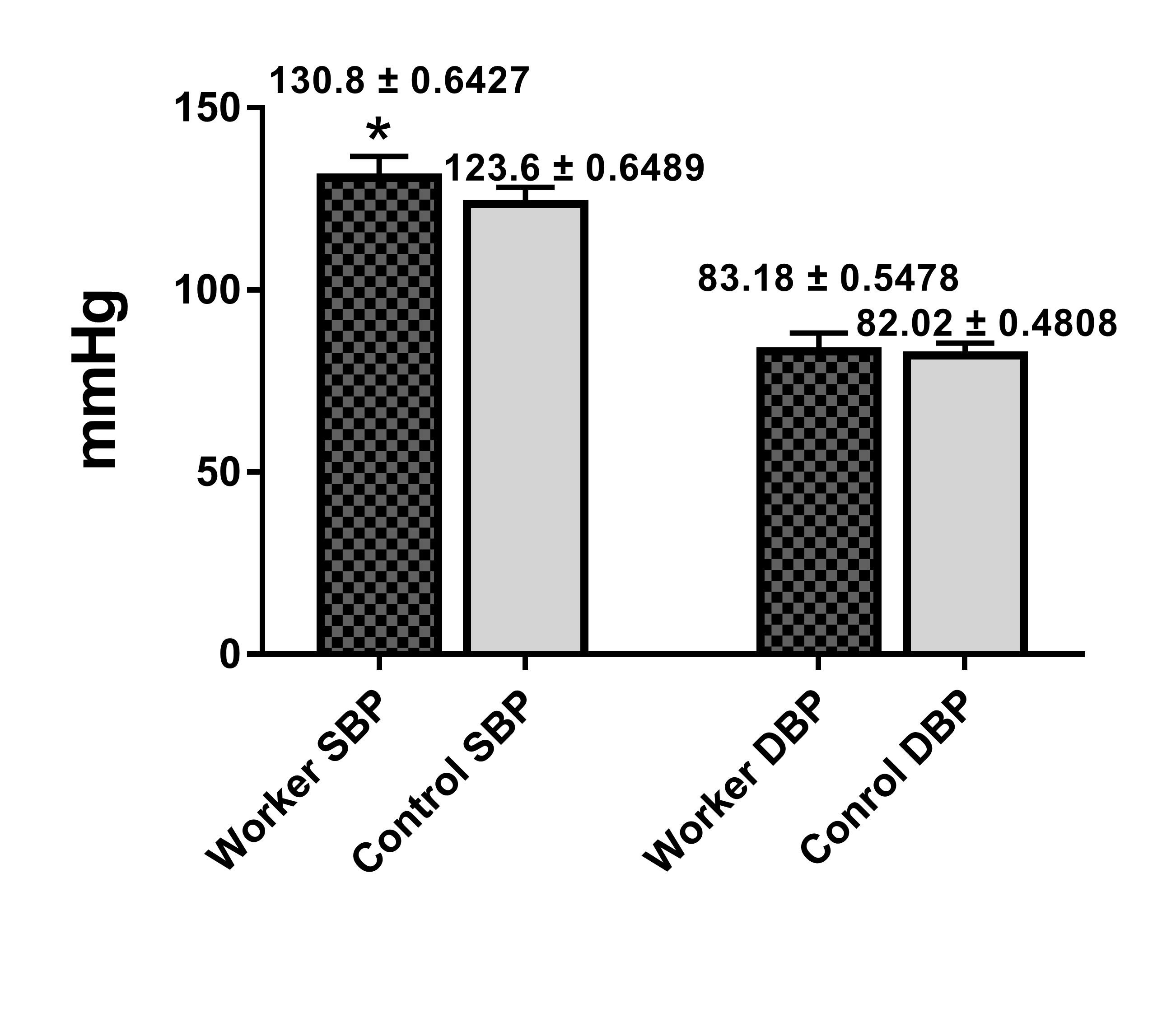 Chronic exposure to gasoline compounds induces serious damages to the homeostasis of cardiovascular systems, resulting in elevated blood pressure. Cardiovascular disorders are relative signs of carbon monoxide toxicity (1). We were interested in examining blood pressure in gasoline stations workers to identify whether these workers are at higher risks of developing high blood pressure or not. We used an automatic sphygmomanometer for this purpose. In the end, we found that there is a significant increase in the systolic blood pressure (SBP) in the individual workers in the experimental group 130.8 ± 0.6427 compared to the control 123.6 ± 0.6489 (Figure 1). In contrast, no significant differences were identified in the diastolic blood pressure of station’s workers 83.18 ± 0.5478 in comparison to the controls 82.02 ± 0.4808 (Figure 1). These data suggest that chronic exposure to gasoline and its components is a crucial risk factor in developing high blood pressure and, potentially, other cardiovascular diseases.
