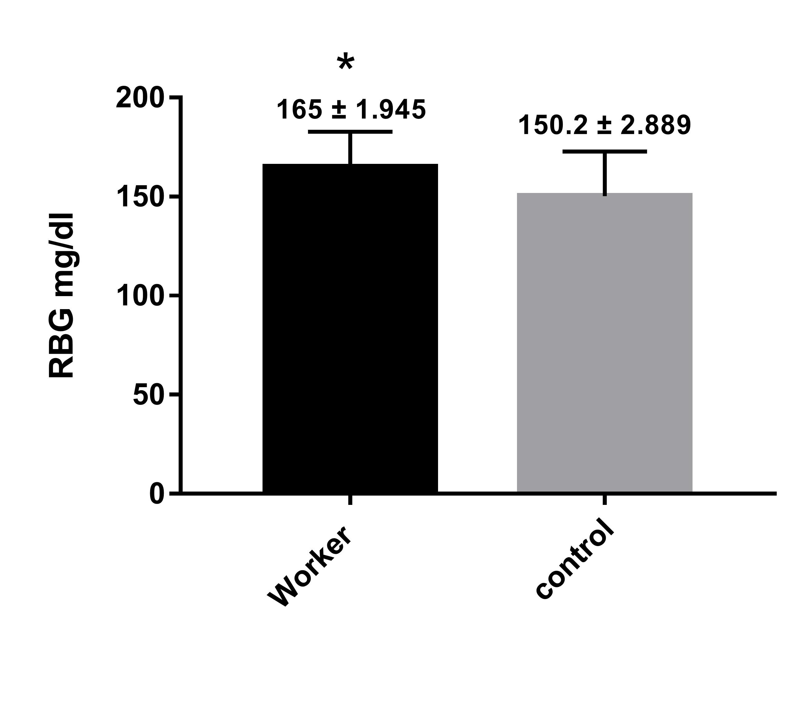 It has long been argued that endocrine-disrupting chemicals components of gasoline are toxic to the human being endocrine system, resulting in endocrine disorders such as obesity and diabetes. Chronic exposure to these chemicals is highly associated with increased incidence of obesity and diabetes(12). Therefore, we investigated blood glucose level and BMI in gasoline station workers and compared this to the participants in the control groups. Analyzing the obtained data, it was found that the blood glucose level is significantly higher in gasoline station workers (165 ± 1.945) compared to the control group (150.2 ± 2.889), as shown in Figure 2. Moreover, it was observed that there is a significant increase in BMI in the workers group (27.77 ± 0.3382) in comparison to the non-workers group (24.29 ± 0.4163), as shown in Figure 3. Hence, the findings of the present research demonstrate that working in gasoline stations could represent a potential threat to the normal function of endocrine system, which in turn, puts workers in these places in a higher danger of susceptible metabolic disorders.